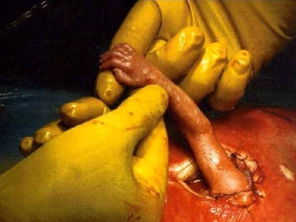 دکوچني ماشوم لاس په انځور کې وينئ ،چې د جراح ډاکټر گوته يې په لاس کې نيولې ده. دا کوچنى ماشوم د سپاينا بيفيډا (Spina bifida)په ناروغي ( هغه ناروغي ،چې معمولا د ويټامين د کموالي له امله د مور په گېډه کې د ماشوم د ملا تير په پوره ډول نه جوړېږي او د ملا د تېر زياتره کړۍ نه سره پيوند کېږي) په ناروغۍ اخته و، دا مرض د خوارځواکۍ له امله مور زاده ورپاتې و، په داسې حال کې چې که حاملدارۍ او د جنين ودې په همدې ډول ادامه پيدا کړې واى په راتلونکو مياشتو کې د ماشوم د مرگ يا فلج کېدو خطرحتمي و،نو په همدې اساس د طبابت په تاريخ کې لومړى ځل وپتېل شوه چې په ٢١ مه اوونۍ ماشوم د مورپه رحم کې دننه د جراحى تر عملياتو لاندې ونيول شي.