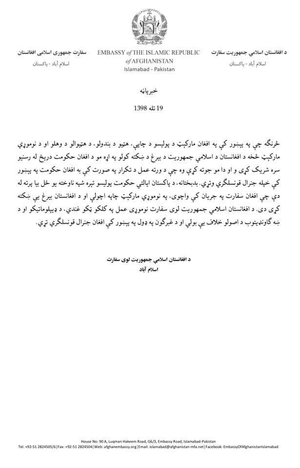 په اسلام اباد کې د افغانستان سفارت وایي، په پېښور کې د افغانستان قونسلګري د اعتراض په ډول تړي.